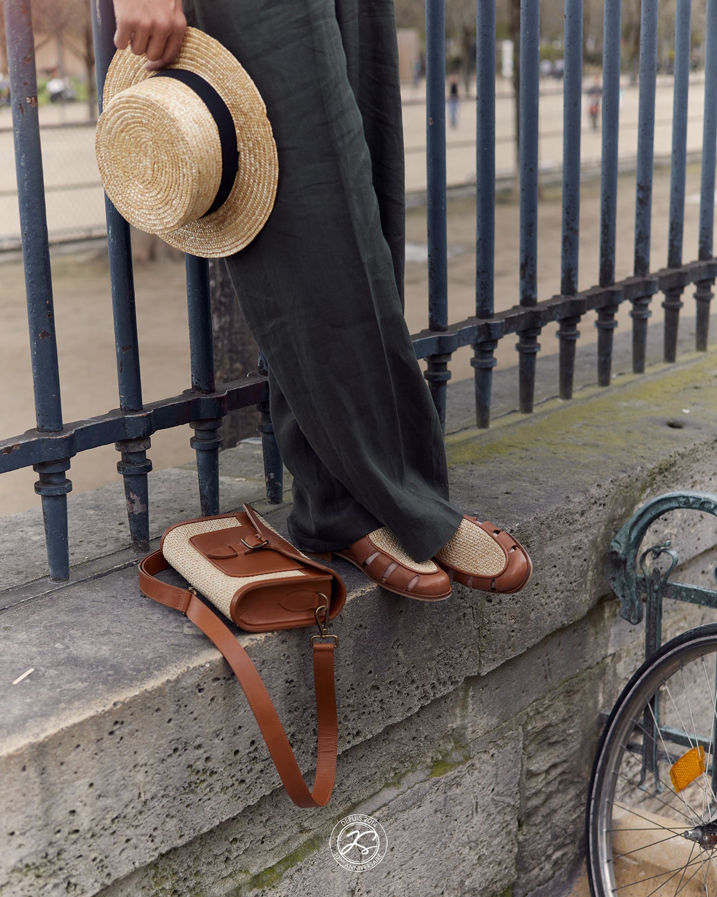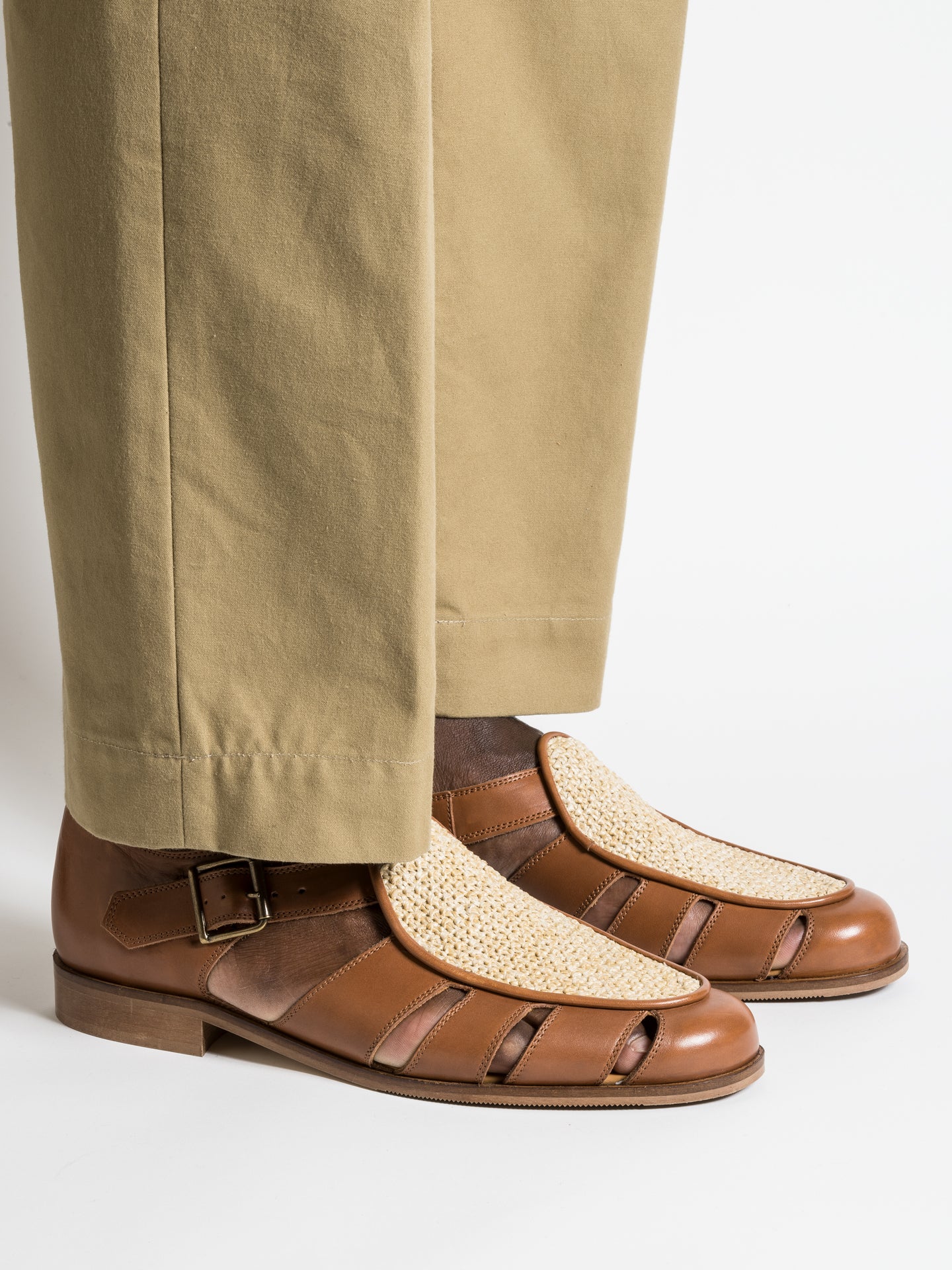 — Tan calf leather & Natural raffia fabric upper